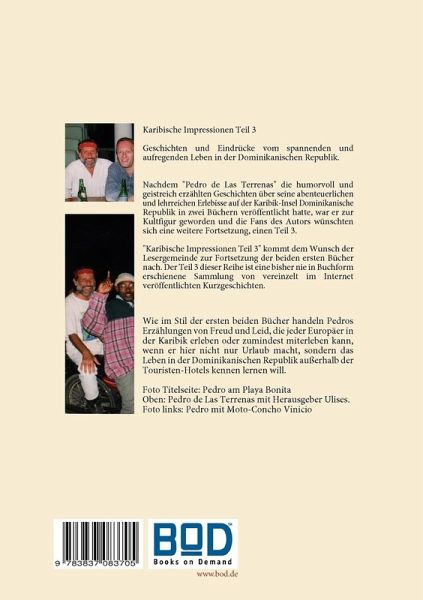 Karibische Impressionen Teil 3Geschichten und Eindrücke vom spannenden Leben in der Dominikanischen Republik. "Karibische Impressionen Teil 3" kommt dem Wunsch der Lesergemeinde zur Fortsetzung der beiden ersten Bücher nach. Der Teil 3 dieser Reihe ist eine bisher nie in Buchform erschienene Sammlung von vereinzelt im Internet veröffentlichten Kurzgeschichten.Wie im Stil der ersten beiden Bücher enthalten sie Erlebnisse von Freud und Leid, die jeder Europäer in der Karibik erleben oder zumindest miterleben kann, wenn er hier nicht nur Urlaub macht, sondern das Leben in der Dominikanischen Republik außerhalb der Touristen-Hotels kennen lernen will.
