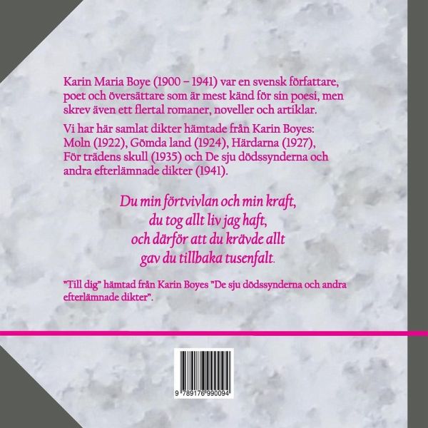 Karin Maria Boye,1900-1941, var en svensk författare, poet och översättare som är mest känd för sin poesi, men skrev även ett flertal romaner, noveller och artiklar. Vi har här samlat dikter hämtade från Karin Boyes Moln -1922, Gömda land -1924, Härdarna -1927, För trädens skull -1935 och De sju dödssynderna och andra efterlämnade dikter -1941.