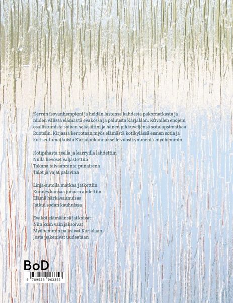 Kerron isovanhempieni ja heidän lastensa kahdesta pakomatkasta ja niiden välissä elämästä evakossa ja paluusta Karjalaan. Kuvailen enojeni osallistumista sotaan sekä äitini ja hänen pikkuveljensä sotalapsimatkaa Ruotsiin. Kirjassa kerrotaan myös elämästä kotikylässä ennen sotia ja kotiseutumatkoista Karjalankannakselle vuosikymmeniä myöhemmin. Kotipihasta reellä ja kärryillä lähdettiin Niillä hevoset valjastettiin Takana taivaanranta punaisena Talot ja vajat palavina Linja-autolla matkaa jatkettiin Kunnes kansaa junaan ahdettiin Elämä härkävaunuissa Jatkui sodan kauhuissa Evakot elämäänsä jatkoivat Niin kuin vain jaksoivat Myöhemmin palasivat Karjalaan Josta pakenivat uudestaan