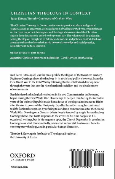 Karl Barth (1886-1968) was the most prolific theologian of the twentieth century. Avoiding simple paraphrasing, Dr Gorringe places the theology in its social and political context, from the First World War through to the Cold War by following Barth's intellectual development through the years that saw the rise of national socialism and the development of communism. Barth initiated a theological revolution in his two Commentaries on Romans, begun during the First World War. His attempt to deepen this during the turbulent years of the Weimar Republic made him a focus of theological resistance to Hitler after the rise to power of the Nazi party. Expelled from Germany, he continued to defy fashionable opinion by refusing to condemn communism after the Second World War. Drawing on a German debate largely ignored by Anglo-Saxon theology Dr Gorringe shows that Barth responds to the events of his time not just in his occasional writings, but in his magnum opus, the Church Dogmatics. In conclusion Dr Gorringe asks what this admittedly patriarchal author still has to contribute to contemporary theology, and in particular human liberation.