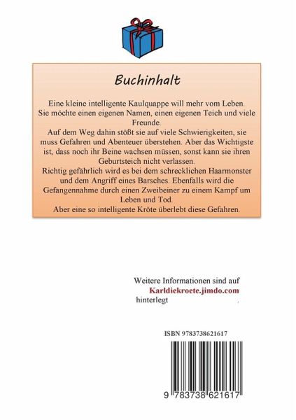 BuchinhaltEine kleine intelligente Kaulquappe will mehr vom Leben.Sie möchte einen eigenen Namen, einen eigenen Teich und viele Freunde.Auf dem Weg dahin stößt sie auf viele Schwierigkeiten, sie muss Gefahren und Abenteuer überstehen. Aber das Wichtigste ist, dass noch ihr Beine wachsen müssen, sonst kann sie ihren Geburtsteich nicht verlassen.Richtig gefährlich wird es bei dem schrecklichen Haarmonster und dem Angriff eines Barsches. Ebenfalls wird die Gefangennahme durch einen Zweibeiner zu einem Kampf um Leben und Tod.Aber eine so intelligente Kröte überlebt diese Gefahren.