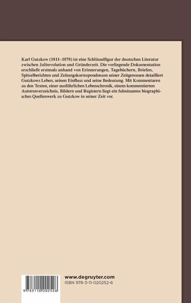 Karl Gutzkow (1811-1878) ist eine Schlüsselfigur der deutschen Literatur zwischen Julirevolution und Gründerzeit. Bis heute gibt es keine nennenswerte Biographie des ungemein vielseitigen, streitbaren und umstrittenen Schriftstellers. Diese Forschungslücke will die vorliegende lebensgeschichtliche Dokumentation ausfüllen, eine vielstimmige Collage aus Erinnerungen, Tagebüchern, Briefen, Spitzelberichten und Zeitungskorrespondenzen von Gutzkows Zeitgenossen, die über sein Leben, seinen Nimbus, seinen Einfluss und seine wechselhaften Beziehungen in der Kulturszene detailliert Auskunft gibt. Über 120 Autoren von H.C. Andersen, Bettina von Arnim, Heinrich Brockhaus, Büchner, Campe, Engels, Fontane, Heine bis zu Richard Wagner und Ludolf Wienbarg kommen zu Wort. Neben literatur- und theatergeschichtlichen Zusammenhängen vermittelt der Band auch reichhaltiges Anschauungsmaterial zur Kultur- und Mentalitätsgeschichte, vor allem aber zur Sozialgeschichte der Literatur im 19. Jahrhundert. Mit Kommentaren zu den Texten, einer ausführlichen Lebenschronik, einem kommentierten Autorenverzeichnis, Bildern und Registern ist dies ein fulminantes biographisches Quellenwerk zu Gutzkow in seiner Zeit.