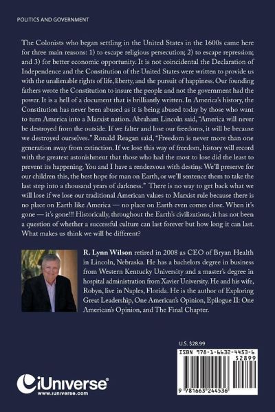 The Colonists who began settling in the United States in the 1600s came here for three main reasons: 1) to escape religious persecution; 2) to escape repression; and 3) for better economic opportunity. It is not coincidental the Declaration of Independence and the Constitution of the United States were written to provide us with the unalienable rights of life, liberty, and the pursuit of happiness. Our founding fathers wrote the Constitution to insure the people and not the government had the power. It is a hell of a document that is brilliantly written. In America's history, the Constitution has never been abused as it is being abused today by those who want to turn America into a Marxist nation. Abraham Lincoln said, "America will never be destroyed from the outside. If we falter and lose our freedoms, it will be because we destroyed ourselves." Ronald Reagan said, "Freedom is never more than one generation away from extinction. If we lose this way of freedom, history will record with the greatest astonishment that those who had the most to lose did the least to prevent its happening. You and I have a rendezvous with destiny. We'll preserve for our children this, the best hope for man on Earth, or we'll sentence them to take the last step into a thousand years of darkness." There is no way to get back what we will lose if we lose our traditional American values to Marxist rule because there is no place on Earth like America - no place on Earth even comes close. When it's gone - it's gone!!! Historically, throughout the Earth's civilizations, it has not been a question of whether a successful culture can last forever but how long it can last. What makes us think we will be different?