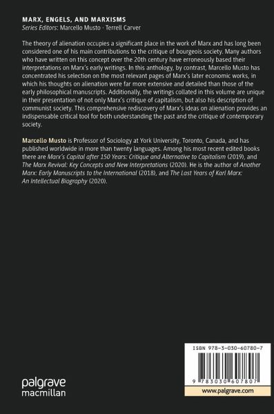 The theory of alienation occupies a significant place in the work of Marx and has long been considered one of his main contributions to the critique of bourgeois society. Many authors who have written on this concept over the 20th century have erroneously based their interpretations on Marx's early writings. In this anthology, by contrast, Marcello Musto has concentrated his selection on the most relevant pages of Marx's later economic works, in which his thoughts on alienation were far more extensive and detailed than those of the early philosophical manuscripts. Additionally, the writings collated in this volume are unique in their presentation of not only Marx's critique of capitalism, but also his description of communist society. This comprehensive rediscovery of Marx's ideas on alienation provides an indispensable critical tool for both understanding the past and the critique of contemporary society.