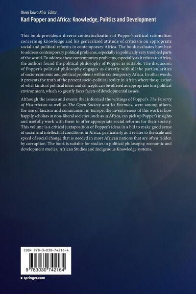 This book provides a diverse contextualization of Popper's critical rationalism concerning knowledge and his generalized attitude of criticism on appropriate social and political reforms in contemporary Africa. The book evaluates how best to address contemporary political problems, especially in politically very troubled parts of the world. To address these contemporary problems, especially as it relates to Africa, the authors found the political philosophy of Popper as suitable. The discussion of Popper's political philosophy engages us directly with all the particularities of socio-economic and political problems within contemporary Africa. In other words, it presents the truth of the present socio-political reality in Africa where the question of what kinds of political ideas and concepts can be offered as appropriate to a political environment, which so greatly faces facets of developmental issues. Although the issues and events that informed the writings of Popper'sThe Poverty of Historicism as well as The Open Society and Its Enemies, were among others, the rise of fascism and communism in Europe, the inventiveness of this work is how happily scholars in non-liberal societies, such as in Africa, can pick up Popper's insights and usefully work with them to offer appropriate social reforms for their society. This volume is a critical juxtaposition of Popper's ideas in a bid to make good sense of social and intellectual conditions in Africa, particularly as it relates to the scale and speed of social change that is needed in most African nations that are often ridden by corruption. The book is suitable for studies in political philosophy, economic and development studies, African Studies and Indigenous Knowledge systems.