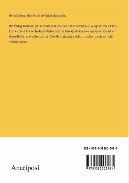 Unveränderter Nachdruck der Originalausgabe. Der Verlag Anatiposi gibt historische Bücher als Nachdruck heraus. Aufgrund ihres Alters können diese Bücher fehlende Seiten oder mindere Qualität aufweisen. Unser Ziel ist es, diese Bücher zu erhalten und der Öffentlichkeit zugänglich zu machen, damit sie nicht verloren gehen.