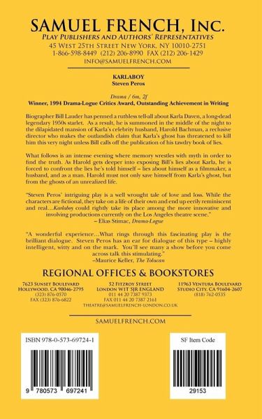 Drama / Characters: 6m, 2f Biographer Bill Lauder has penned a ruthless tell-all about Karla Daven, a long dead legendary 1950's starlet. As a result, he is summoned in the middle of the night to the dilapidated mansion of Karla's celebrity husband, Harold Bachman, a reclusive director who makes the outlandish claim that Karla's ghost has threatened to kill him this very night unless Bill calls off the publication of his tawdry book of lies. What follows is an intense evening where memory wrestles with myth in order to find the truth. As Harold gets deeper into exposing Bill's lies about Karla, he is forced to confront the lies he's told himself - lies about himself as a filmmaker, a husband, and as a man. Harold must not only save himself from Karla's ghost, but from the ghosts of an unrealized life. * WINNER * 1994 Drama-Logue Critics Award Outstanding Achievement in Writing "Steven Peros' intriguing play is a well wrought tale of love and loss, set against the sweeping background of the golden era of Hollywood ... while the characters are fictional, they take on a life of their own and end up eerily reminiscent and real ... Karlaboy could rightly take its place among the more innovative and involving productions currently on the Los Angeles theatre scene." - Elias Stimac, Drama-Logue "A wonderful experience ... what rings through this totally fascinating play is the brilliant dialogue. Steven Peros has an ear for dialogue of this type - highly intelligent, witty and on the mark. You'll see many a show before you come across talk this stimulating." - Maurice Keller, The Tolucan