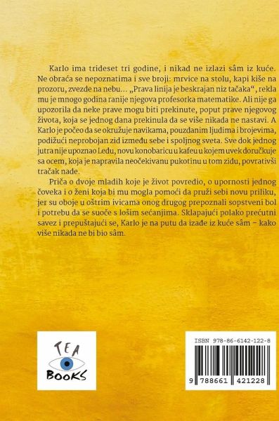 Karlo ima trideset tri godine, i nikad ne izlazi sâm iz küe. Ne obräa se nepoznatima i sve broji: mrvice na stolu, kapi ki¿e na prozoru, zvezde na nebu... ¿Prava linija je beskrajan niz täaka", rekla mu je mnogo godina ranije njegova profesorka matematike. Ali nije ga upozorila da neke prave mogu biti prekinute, poput prave njegovog ¿ivota, koja se jednog dana prekinula da se vi¿e nikada ne nastavi. A Karlo je pöeo da se okrüuje navikama, pouzdanim ljudima i brojevima, podi¿üi neprobojan zid izme¿u sebe i spoljnog sveta. Sve dok jednog jutra nije upoznao Ledu, novu konobaricu u kafeu u kojem uvek dorükuje sa ocem, koja je napravila neöekivanu pukotinu u tom zidu, povrativ¿i träak nade. Pri¿a o dvoje mladih koje je ¿ivot povredio, o upornosti jednog ¿oveka i o ¿eni koja bi mu mogla pomöi da prüi sebi novu priliku, jer su oboje u ötrim ivicama onog drugog prepoznali sopstveni bol i potrebu da se suöe s löim se¿anjima. Sklapajüi polako pre¿utni savez i prepütajüi se, Karlo je na putu da izäe iz küe sâm - kako vi¿e nikada ne bi bio sâm.