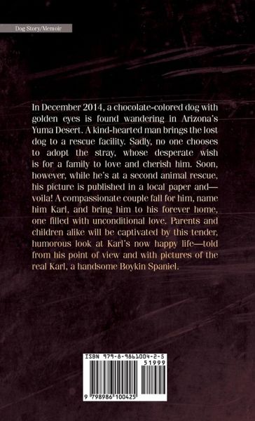 In December 2014, a chocolate-colored dog with golden eyes is found wandering in Arizona's Yuma Desert. A kind-hearted man brings the lost dog to a rescue facility. Sadly, no one chooses to adopt the stray, whose desperate wish is for a family to love and cherish him. Soon, however, while he's at a second animal rescue, his picture is published in a local paper and-voila! A compassionate couple fall for him, name him Karl, and bring him to his forever home, one filled with unconditional love. Parents and children alike will be captivated by this tender, humorous look at Karl's now happy life-told from his point of view and with pictures of the real Karl, a handsome Boykin Spaniel.