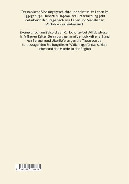 Germanische Siedlungsgeschichte und spirituelles Leben im Eggegebirge. Hubertus Hagemeiers Untersuchung geht detailreich der Frage nach, wie Leben und Siedeln der Vorfahren zu deuten sind. Exemplarisch am Beispiel der Karlschanze bei Willebadessen (in früheren Zeiten Behmburg genannt), entwickelt er anhand von Belegen und Überlieferungen die These von der herausragenden Stellung dieser Wallanlage für das soziale Leben und den Handel in der Region.