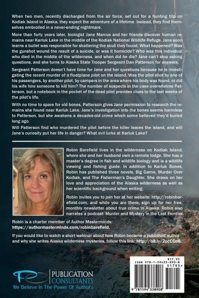 When two men, recently discharged from the air force, set out for a hunting trip on Kodiak Island in Alaska, they expect the adventure of a lifetime. Instead, they find themselves embroiled in a never-ending nightmare. More than forty years later, biologist Jane Marcus and her friends discover human remains near Karluk Lake in the middle of the Kodiak National Wildlife Refuge. Jane soon learns a bullet was responsible for shattering the skull they found. What happened? Was the gunshot wound the result of a suicide, or was it homicide? Who was this individual who died in the middle of the wilderness, and when did he die? Jane can't stop asking questions, and she turns to Alaska State Trooper Sergeant Dan Patterson for answers. Sergeant Patterson doesn't have time for Jane and her questions because he is investigating the recent murder of a floatplane pilot on the island. Was the pilot shot by one of his passengers, by another pilot, by campers in the area where his body was found, or did his wife hire someone to kill him? The number of suspects in the case overwhelms Patterson, but a notebook in the pocket of the dead pilot provides clues to the last weeks of the pilot's life. With no time to spare for old bones, Patterson gives Jane permission to research the remains she found near Karluk Lake. Jane's investigation into the bones seems harmless to Patterson, but she awakens a decades-old crime which some believed they'd buried long ago. Will Patterson find who murdered the pilot before the killer leaves the island, and will Jane's curiosity put her life in danger? What evil lurks at Karluk Lake?
