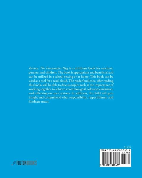 Karma: The Peacemaker Dog is a children's book for teachers, parents, and children. The book is appropriate and beneficial and can be utilized in a school setting or at home. This book can be used as a tool for a read-aloud. The reader/audience, after reading this book, will be able to discuss topics such as the importance of working together to achieve a common goal, tolerance/inclusion, and reflecting on one's actions. In addition, the child will gain insight and comprehend what responsibility, respectfulness, and kindness mean.