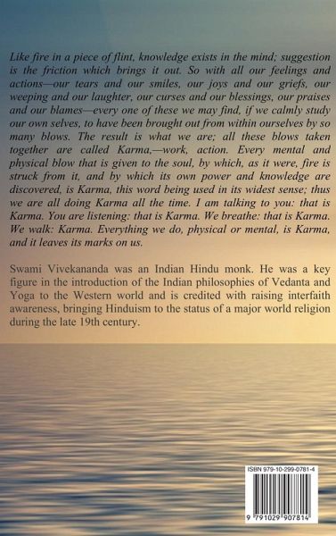 Like fire in a piece of flint, knowledge exists in the mind; suggestion is the friction which brings it out. So with all our feelings and actions—our tears and our smiles, our joys and our griefs, our weeping and our laughter, our curses and our blessings, our praises and our blames—every one of these we may find, if we calmly study our own selves, to have been brought out from within ourselves by so many blows. The result is what we are; all these blows taken together are called Karma,—work, action. Every mental and physical blow that is given to the soul, by which, as it were, fire is struck from it, and by which its own power and knowledge are discovered, is Karma, this word being used in its widest sense; thus we are all doing Karma all the time. I am talking to you: that is Karma. You are listening: that is Karma. We breathe: that is Karma. We walk: Karma. Everything we do, physical or mental, is Karma, and it leaves its marks on us. Swami Vivekananda was an Indian Hindu monk. He was a key figure in the introduction of the Indian philosophies of Vedanta and Yoga to the Western world and is credited with raising interfaith awareness, bringing Hinduism to the status of a major world religion during the late 19th century.