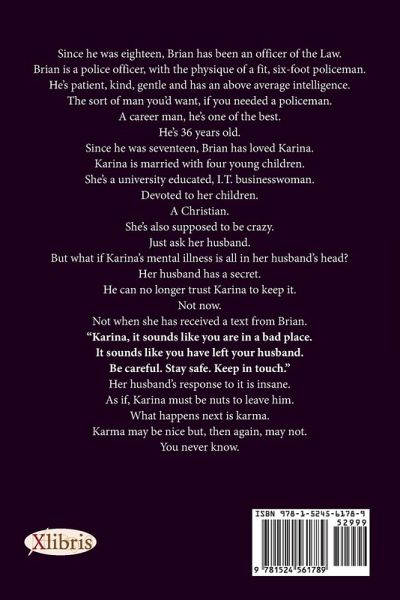 You crazy bitch. Since he was eighteen, Brian has been an officer of the law. Brian is a police officer with the physique of a six-foot policeman. He's patient, kind, gentle, and has an above-average intelligence-the sort of man you'd want, if you needed a policeman. As a career man, he's one of the best. He's thirty-six years old. Since he was seventeen, Brian has loved Karina. Karina is married with four young children. She's a university-educated IT businesswoman. Devoted to her children. A Christian. She's also supposed to be crazy. Just ask her husband. But what if Karina's mental illness is all in her husband's head? Her husband has a secret. He can no longer trust Karina to keep it. Not now. Not when she has received a text from Brian. "Karina, it sounds like you are in a bad place. It sounds like you have left your husband. Be careful. Stay safe. Keep in touch." Her husband's response to it is insane. As if Karina must be mad to leave him. What happens next is karma. Karma may be nice but, then again, maybe not. You never know.