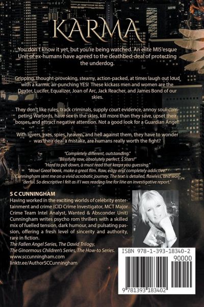 We are not alone, invisible agents protect us. David Howard started life as a beautiful trusting choirboy until 'they' turned him into an avenging killer with a list. We follow his journey from orphan, to church, to the elite's sordid dens of iniquity, to prison, When offered a release deal to join a rogue government agency he accepts, having no idea that invisible entities are watching... or who his father really is. A fast-paced, thought-provoking, rom crime drama that haunts. Grab a glass of wine, close the bedroom door, and read alone. THE FALLEN ANGEL SERIES (standalone - contemporary fantasy drama) The Deal, Karma, The Calling, Already Dead, They Know, Conscious (pre-order) REVIEWS 'What if all we know about good and evil is only the surface of the truth?' "It has a Warehouse 13, Reaper, Fringe, Torchwood, Heroes, Shadow Hunters, Women of the Otherworld, and Breakout Kings vibe." 'A special team guards us, but they don't look and act like you'd think.' 'Wow! Makes a great film. Raw, edgy, completely addictive.' 'There is romance and it's definitely of the sizzling variety with very hot chemistry.' 'It plays like a film. An exciting trip to an originally created world.' 'What if angels are simply enhanced humans who made deals with the higher powers?' 'Easy, faultless, I wanted to jump into the pages and be part of it.' 'Fast-paced, witty comments mixed with an almost thinking-out-loud style that moves the reader.' 'Will truly be one of those magical books that are a must-read.' THE DAVID TRILOGY (backstory - rom thriller) The Penance List, Unfinished Business, For My Sins. REVIEWS "It SIZZLES! An erotic, neurotic, sensual vision that's rather stunning." (screenplay) "Writing doesn't get any better than this." "Blown away to the point of speechless, shocking, vivid, bloody well written!" "I read in one sitting." "I raise a glass, I'd love to meet anyone who writes like this." AUTHOR SCCUNNINGHAM SCCunningham creates a skilled mix of fuelled tension, dark humour, and raw passion. British-born of Irish roots she married rock musician, composer Raf Ravenscroft (of 'Baker Street' sax fame), is proud mum to artist Scarlett Raven (of Castle Galleries), and has worked within the below industries, providing a font of authenticity to her storylines.fashion (beauty, catwalk model) music to film production (television, film, commercials) sports celebrity & event management (football, horseracing, tennis, golf) child charity (Africa) crime (police crime investigator, wanted & absconder unit, major crime team intel analyst, victim support) SUPPORTED CAUSES Veterans Child Animal and Planet Protection. A THANK YOU TO TALENTED AUDIOBOOK NARRATORS Susan Knight, Chas Burns, Grant Simpson, Sarah Edwards. Web - sccunningham(dot)com Socials - @sccunningham8