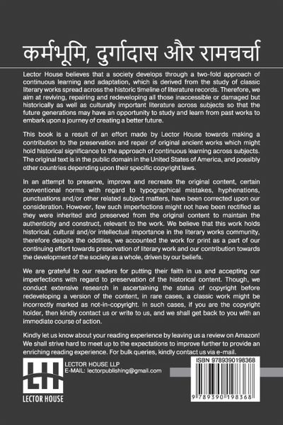 Karmabhumi, Durgadas Aur Ramcharcha This book is a result of an effort made by us towards making a contribution to the preservation and repair of original classic literature. In an attempt to preserve, improve and recreate the original content, we have worked towards: 1. Type-setting & Reformatting: The complete work has been re-designed via professional layout, formatting and type-setting tools to re-create the same edition with rich typography, graphics, high quality images, and table elements, giving our readers the feel of holding a 'fresh and newly' reprinted and/or revised edition, as opposed to other scanned & printed (Optical Character Recognition - OCR) reproductions. 2. Correction of imperfections: As the work was re-created from the scratch, therefore, it was vetted to rectify certain conventional norms with regard to typographical mistakes, hyphenations, punctuations, blurred images, missing content/pages, and/or other related subject matters, upon our consideration. Every attempt was made to rectify the imperfections related to omitted constructs in the original edition via other references. However, a few of such imperfections which could not be rectified due to intentional\unintentional omission of content in the original edition, were inherited and preserved from the original work to maintain the authenticity and construct, relevant to the work. We believe that this work holds historical, cultural and/or intellectual importance in the literary works community, therefore despite the oddities, we accounted the work for print as a part of our continuing effort towards preservation of literary work and our contribution towards the development of the society as a whole, driven by our beliefs. We are grateful to our readers for putting their faith in us and accepting our imperfections with regard to preservation of the historical content. HAPPY READING!