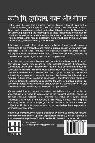 Karmabhumi, Durgadas, Gaban Aur Godaan This book is a result of an effort made by us towards making a contribution to the preservation and repair of original classic literature. In an attempt to preserve, improve and recreate the original content, we have worked towards: 1. Type-setting & Reformatting: The complete work has been re-designed via professional layout, formatting and type-setting tools to re-create the same edition with rich typography, graphics, high quality images, and table elements, giving our readers the feel of holding a 'fresh and newly' reprinted and/or revised edition, as opposed to other scanned & printed (Optical Character Recognition - OCR) reproductions. 2. Correction of imperfections: As the work was re-created from the scratch, therefore, it was vetted to rectify certain conventional norms with regard to typographical mistakes, hyphenations, punctuations, blurred images, missing content/pages, and/or other related subject matters, upon our consideration. Every attempt was made to rectify the imperfections related to omitted constructs in the original edition via other references. However, a few of such imperfections which could not be rectified due to intentional\unintentional omission of content in the original edition, were inherited and preserved from the original work to maintain the authenticity and construct, relevant to the work. We believe that this work holds historical, cultural and/or intellectual importance in the literary works community, therefore despite the oddities, we accounted the work for print as a part of our continuing effort towards preservation of literary work and our contribution towards the development of the society as a whole, driven by our beliefs. We are grateful to our readers for putting their faith in us and accepting our imperfections with regard to preservation of the historical content. HAPPY READING!