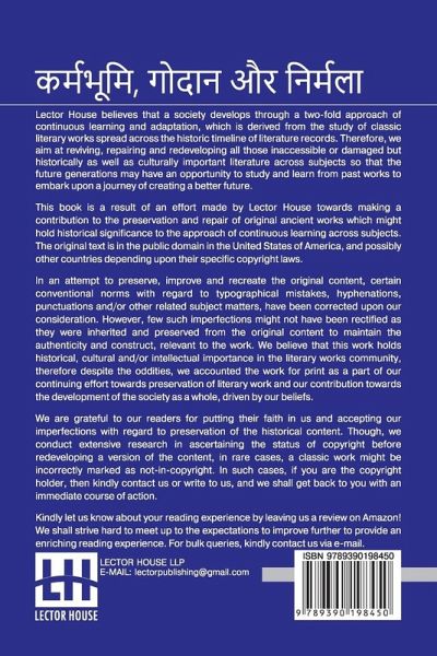 Karmabhumi, Godaan Aur Nirmala This book is a result of an effort made by us towards making a contribution to the preservation and repair of original classic literature. In an attempt to preserve, improve and recreate the original content, we have worked towards: 1. Type-setting & Reformatting: The complete work has been re-designed via professional layout, formatting and type-setting tools to re-create the same edition with rich typography, graphics, high quality images, and table elements, giving our readers the feel of holding a 'fresh and newly' reprinted and/or revised edition, as opposed to other scanned & printed (Optical Character Recognition - OCR) reproductions. 2. Correction of imperfections: As the work was re-created from the scratch, therefore, it was vetted to rectify certain conventional norms with regard to typographical mistakes, hyphenations, punctuations, blurred images, missing content/pages, and/or other related subject matters, upon our consideration. Every attempt was made to rectify the imperfections related to omitted constructs in the original edition via other references. However, a few of such imperfections which could not be rectified due to intentional\unintentional omission of content in the original edition, were inherited and preserved from the original work to maintain the authenticity and construct, relevant to the work. We believe that this work holds historical, cultural and/or intellectual importance in the literary works community, therefore despite the oddities, we accounted the work for print as a part of our continuing effort towards preservation of literary work and our contribution towards the development of the society as a whole, driven by our beliefs. We are grateful to our readers for putting their faith in us and accepting our imperfections with regard to preservation of the historical content. HAPPY READING!