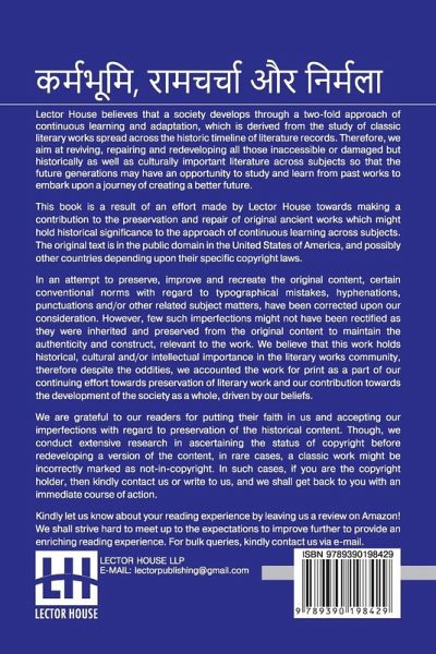 Karmabhumi, Ramcharcha Aur Nirmala This book is a result of an effort made by us towards making a contribution to the preservation and repair of original classic literature. In an attempt to preserve, improve and recreate the original content, we have worked towards: 1. Type-setting & Reformatting: The complete work has been re-designed via professional layout, formatting and type-setting tools to re-create the same edition with rich typography, graphics, high quality images, and table elements, giving our readers the feel of holding a 'fresh and newly' reprinted and/or revised edition, as opposed to other scanned & printed (Optical Character Recognition - OCR) reproductions. 2. Correction of imperfections: As the work was re-created from the scratch, therefore, it was vetted to rectify certain conventional norms with regard to typographical mistakes, hyphenations, punctuations, blurred images, missing content/pages, and/or other related subject matters, upon our consideration. Every attempt was made to rectify the imperfections related to omitted constructs in the original edition via other references. However, a few of such imperfections which could not be rectified due to intentional\unintentional omission of content in the original edition, were inherited and preserved from the original work to maintain the authenticity and construct, relevant to the work. We believe that this work holds historical, cultural and/or intellectual importance in the literary works community, therefore despite the oddities, we accounted the work for print as a part of our continuing effort towards preservation of literary work and our contribution towards the development of the society as a whole, driven by our beliefs. We are grateful to our readers for putting their faith in us and accepting our imperfections with regard to preservation of the historical content. HAPPY READING!