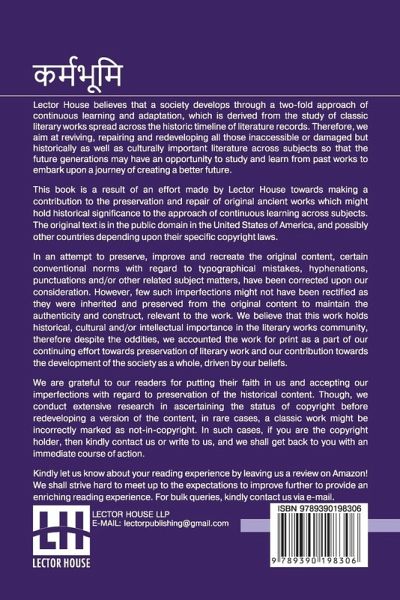 Karmabhumi This book is a result of an effort made by us towards making a contribution to the preservation and repair of original classic literature. In an attempt to preserve, improve and recreate the original content, we have worked towards: 1. Type-setting & Reformatting: The complete work has been re-designed via professional layout, formatting and type-setting tools to re-create the same edition with rich typography, graphics, high quality images, and table elements, giving our readers the feel of holding a 'fresh and newly' reprinted and/or revised edition, as opposed to other scanned & printed (Optical Character Recognition - OCR) reproductions. 2. Correction of imperfections: As the work was re-created from the scratch, therefore, it was vetted to rectify certain conventional norms with regard to typographical mistakes, hyphenations, punctuations, blurred images, missing content/pages, and/or other related subject matters, upon our consideration. Every attempt was made to rectify the imperfections related to omitted constructs in the original edition via other references. However, a few of such imperfections which could not be rectified due to intentional\unintentional omission of content in the original edition, were inherited and preserved from the original work to maintain the authenticity and construct, relevant to the work. We believe that this work holds historical, cultural and/or intellectual importance in the literary works community, therefore despite the oddities, we accounted the work for print as a part of our continuing effort towards preservation of literary work and our contribution towards the development of the society as a whole, driven by our beliefs. We are grateful to our readers for putting their faith in us and accepting our imperfections with regard to preservation of the historical content. HAPPY READING!