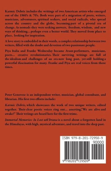 Karmic Debris presents the writings of two unique American artists who rose out of the 1960's - 70's. Both were part of a migration of poets, writers, musicians, adventurers, spiritual seekers, social radicals who spread across the country and the world, becoming contributors to a pivotal era of change. They were nomads searching for answers, freedom and wisdom, striving for new means of expression. They moved from place to place... not looking for homes, but for inspiration. There is also a love story embedded in their words, about a complex relationship filled with the passion of two artists. Piya Italia and Franke Wednesday were Avant performers, musicians, as well as writers, exploring the boundaries as creative revolutionaries. These surviving writings are full of the idealism, doubt, and experimentation of a unique era... now long past... but still holding a powerful influence and sway over many. Karmic Debris is edited by Peter D. Genovese, author of the novel Immortal Memories in Lost utk'Irtana, as well as one of the authors of Karmic Debris.