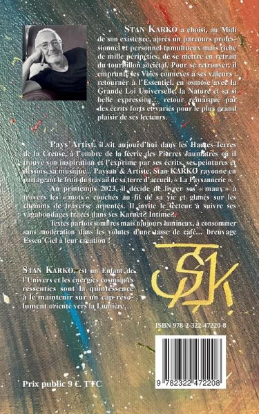 Stan KARKO a choisi, au Midi de son existence, après un parcours professionnel et personnel tumultueux mais riche de mille péripéties, de se mettre en retrait du tourbillon sociétal. Pour se retrouver, il emprunte les Voies connexes à ses valeurs : retourner à l'Essentiel, en osmose avec la Grande Loi Universelle, la Nature et sa si belle expression... retour remarqué par des écrits forts et variés pour le plus grand plaisir de ses lecteurs. Pays'Artist, il vit aujourd'hui dans les Hautes-Terres de la Creuse, à l'ombre de la féerie des Pierres Jaumâtres où il trouve son inspiration et l'exprime par ses écrits, ses peintures et dessins, sa musique... Paysan & Artiste, Stan KARKO rayonne en partageant le fruit du travail de sa terre d'accueil, "La Paysannerie". Il est un Enfant de l'Univers et les énergies cosmiques ressenties sont la quintessence à le maintenir sur un cap résolument orienté vers la Lumière...