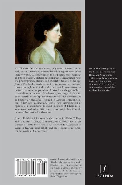 Karoline von Günderrode's biography - and in particular her early death - have long overshadowed an appreciation of her literary works. Closer attention to her poems, prose writings and plays reveals Günderrode's remarkable engagement with the philosophical, literary, and scientific debates of her age. Joanna Raisbeck's study is the first to uncover a consistent theme throughout Günderrode, one which stems from the desire to combat the prevalent philosophical dangers of both materialism and atheism. Günderrode, it emerges, is the most consistent thinker of Spinozist pantheism - the idea that God and nature are the same - not just in German Romanticism, but in her age. Günderrode uses a new interpretation of Spinoza as a means to write about questions of determinism, autonomy, and what differences there might be, if at all, between humankind and nature.Joanna Raisbeck is Lecturer in German at St Hilda's College and Wadham College, University of Oxford. She is the winner of both the Klaus Heyne-Award for Research in German Romanticism (2021) and the Novalis Prize (2022) for her work on Günderrode.