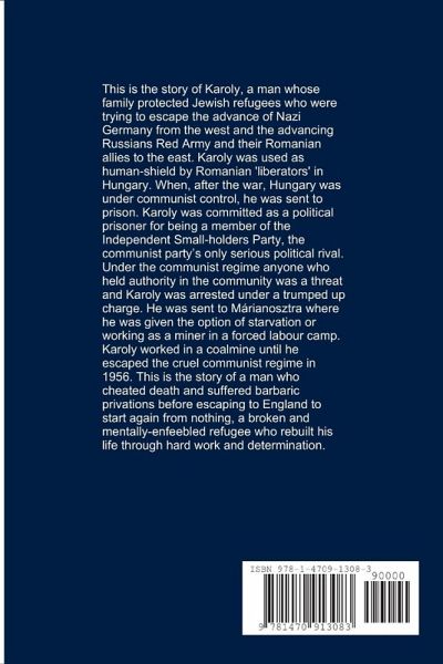 This is the story of Karoly, a man whose family tried to save Jewish refugees from the clutches of German troops advancing from the west and the advancing Russians Red Army and their Romanian allies to the east. Karoly was used as human-shield by Romanian 'liberators' in Hungary. When, after the war, Hungary was under Russian communist control, he was arrested for being part of the Smallholder's Youth Party, a farmer's union. He was transferred to Márianosztra where he was given the option of starvation rations or working as a miner in a forced labour camp. Karoly worked in a coalmine until he escaped the regime in 1956. This is the story of a man who cheated death and suffered unimaginable privations before escaping to England to start again from nothing, a broken enfeebled refugee who rebuilt his life through hard work and determination.