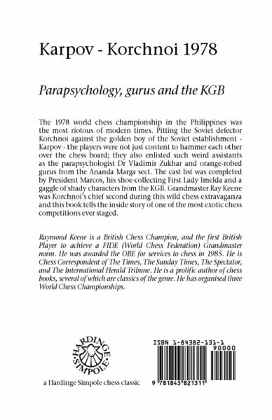 The 1978 world chess championship in the Philippines was the most riotous of modern times. Pitting the soviet defector Korchnoi against the golden boy of the soviet establishment - Karpov - the players were not just content to hammer each other over the chess board; they also enlisted such weird assistants as the parapsychologist Dr Vladimir Zukhar and orange-robed gurus from the Ananda Marga sect. The dramatis personae were completed by President Marcos, his shoe-collecting First Lady Imelda and a gaggle of shady characters from the KGB. Grandmaster Ray Keene was Korchnoi's chief second during this wild chess extravaganza and this book tells the inside story of one of the most exotic chess competitions ever staged.