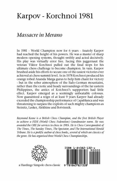 In 1981 - World Champion now for 6 years - Anatoly Karpov had reached the height of his powers. He was a master of sharp modern opening systems, thought swiftly and acted decisively. His play was virtually error free. Facing this juggernaut the veteran Viktor Korchnoi pulled out the final stops for his ultimate chess challenge to become champion. In vain. Karpov brushed aside his efforts to secure one of the easiest victories ever achieved at chess summit level. As in 1978 Korchnoi produced his orange robed Ananda Marga gurus to help him chant for victory - but in the sober atmosphere of the Italo-german mountains-rather than the exotic and heady surroundings of the far eastern Philippines-the antics of Korchnoi's suppporters had little effect. Karpov emerged as a seemingly unbeatable colossus. Now guaranteed a reign of at least 9 years Karpov had already exceeded the championship performance of Capablanca and was threatening to surpass the exploits of such mighty champions as Steinitz, Lasker, Alekhine and Botvinnik.