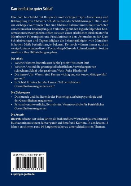 Elke Pohl beschreibt mit Beispielen und wichtigen Tipps Auswirkung und Bekämpfung von fehlender Schlafqualität oder Schlafstörungen. Diese sind ein wichtiges Warnzeichen für eine fehlende Balance und zumeist Vorboten von chronischer Erschöpfung. In Verbindung mit den logisch folgenden Konzentrationsschwierigkeiten stellen sie auch einen erheblichen Risikofaktor für Mitarbeiter, Führungsstil und Produktivität in den Unternehmen dar. Dass Schlafstörungen und Tagesmüdigkeit die Leistungsfähigkeit von Menschen in hohem Maße beeinflussen, ist bekannt. Dennoch widmen immer noch zu wenige Unternehmen diesem Thema die gebührende Aufmerksamkeit. Positive Ansätze sollen Hilfestellungen geben.