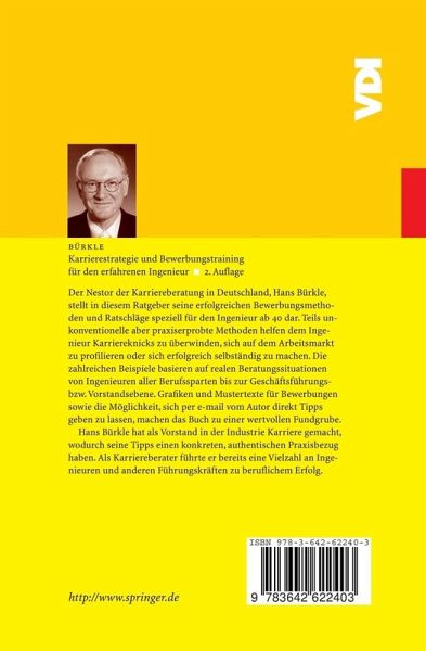 Ein Buch zur erfolgreichen Karriereplanung und Aktivbewerbung. Es richtet sich an Ingenieure, die bereits im Berufsleben stehen und eine zweite Karriere planen. Die praxiserprobte EKS-Methode unterstützt den Ingenieur dabei, Karriereknicks zu überwinden, persönliche Spitzenleistungen aufzubauen und sich auf dem Arbeitsmarkt zu profilieren. Außerdem beschreibt es einen neuen Ansatz zur Begründung einer selbständigen Existenz. Die zahlreichen Praxisbeispiele basieren auf realen Beratungssituationen. Grafiken, Mustertexte für Bewerbungen sowie die Möglichkeit, sich per Email vom Autor direkt Tipps geben zu lassen, machen dieses Buch zu einem wertvollen Ratgeber.