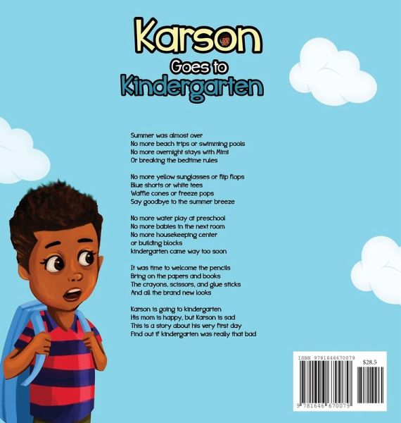 Karson is about to enter Kindergarten and he is a little scared. He and his mother spend time preparing for his big day, but buying new clothes, new school supplies, and getting a new haircut does nothing to erase his Kindergarten fears. Read to find out what happens to Karson on his very first day.