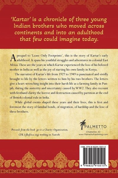 "Kartar, An Indian Immigrant in East Africa, 1927 to 1949". This non-fiction book is about Kartar's life in colonial East Africa, after landing there in 1927 in search of better economic and employment opportunities. Part one (1927-1942) provides an insight to a fifteen-year-old Indian immigrant's overwhelming feelings of loneliness and his struggles to start a new life among alien cultures of the native people and the new migrants from Europe. It depicts how his love for adventure and determination to overcome challenges, helped him to settle in the heart of Africa. It is based on the personal written memorabilia and audiotapes left behind by our father, Kartar. Part two of the book contains translations of letters written to Kartar in East Africa, by his two brothers in India, during the six-year period 1943-1949. They provide a personal angle on history and give us a glimpse into the intimate thoughts of the writers. They recount with first hand clarity their life as rural farmers during the austerity and uncertainty caused by WW2. They give a heart wrenching insight into the destruction caused by Partition at the end of British colonial rule in India. These plain-spoken letters with beautiful descriptive details take us back on a personal journey, reliving the dynamics of a joint farming family in a small village of Punjab. They bring to life the family's struggles, and how their overwhelming unity, love and support for each other ultimately helped them to survive the challenges. They show how the hearts of three brothers remained connected and intertwined, despite the thousands of miles separating them. This book is a prequel to "Leave Only Footprints" written by Jaihind S Sumal. Some of the information overlaps with Kartar's memoirs in the earlier book.