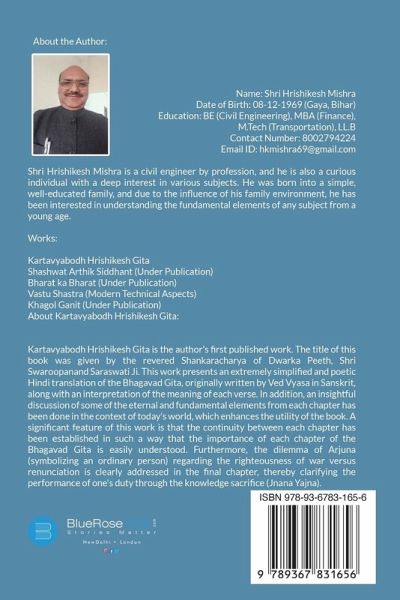 "Kartavyabodh" is the first published work by author Hrishikesh Geeta. The title of this book was conferred by the revered Shankaracharya of Dwarka Peeth, Shri Swaroopanand Saraswati Ji. This work presents an exceptionally simple and melodious Hindi translation of the Shrimad Bhagavad Gita, originally composed in Sanskrit by Ved Vyasa, along with the essence of the original verses. The book also offers a profound exploration of certain eternal principles from each chapter in the context of contemporary life, which enhances its relevance and utility. A notable feature of this work is the seamless connection established between each chapter and the next, making it easy to comprehend the significance of every chapter of the Shrimad Bhagavad Gita. Additionally, the resolution of Arjuna's (a common man's) dilemma-whether to engage in battle or renounce the world-is beautifully elucidated in the final chapter, culminating in the performance of one's duty as a form of gyan-yajna (sacrificial act of knowledge).