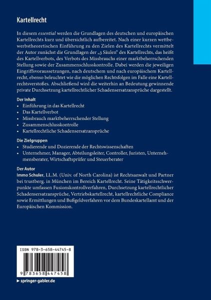 In diesem essential werden die Grundlagen des deutschen und europäischen Kartellrechts kurz und übersichtlich aufbereitet. Nach einer kurzen wettbewerbstheoretischen Einführung zu den Zielen des Kartellrechts vermittelt der Autor zunächst die Grundlagen der "3 Säulen" des Kartellrechts, das heißt des Kartellverbots, des Verbots des Missbrauchs einer marktbeherrschenden Stellung sowie der Zusammenschlusskontrolle. Dabei werden die jeweiligen Eingriffsvoraussetzungen, nach deutschem und nach europäischem Kartellrecht, ebenso beleuchtet wie die möglichen Rechtsfolgen im Falle eine Kartellrechtsverstoßes. Abschließend wird die weiterhin an Bedeutung gewinnende private Durchsetzung kartellrechtlicher Schadensersatzansprüche dargestellt.