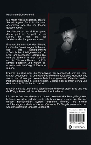Herzlichen Glückwunsch!Sie lernen vielleicht gerade, das für Sie wichtigste Buch kennen, was Sie seit langem gelesen haben!Sie glauben mir nicht?Nun, genau darum geht es. Es geht um die Lügen, die man Sie seit Jahrtausenden hat glauben lassen. Erfahren Sie alles über den "Missing Link" in der Evolutionsgeschichte und über das Genexperiment, außerirdischer Intelligenzen auf der Erde, am Menschen. Erfahren Sie, wen die Sumerer in ihren Tontafeln als die, "die vom Himmel zur Erde kamen" betitelten und warum der erste sumerische König 28.800 Jahre regierte.Erfahren sie alles über die Versklavung der Menschheit, wer die Bibel wirklich geschrieben hat und warum es nie eine theologische Figur, namens Jesus oder Moses gab. Warum Ärzte keine gesunden Patienten wollen, Politiker sich nicht für ihr Volk einsetzen, Gesetze nicht zu Ihrem Schutz und Gerichte nicht für Ihr Recht da sind. Erfahren Sie alles über die selbsternannten Herrscher dieser Erde und was die Königshäuser und der Vatikan damit zu tun haben.Auf über 450 Seiten werde ich Sie aus diesen und vielen weiteren Glaubensgefängnissen befreien. Vor allem jedoch, werde ich Ihnen Wege zeigen, wie Sie sich diesem herrschenden System entziehen können, Ihre Freiheit zurückerlangen und wieder das tun können, wofür Sie geboren wurden und was der eigentliche Sinn des Lebens ist.