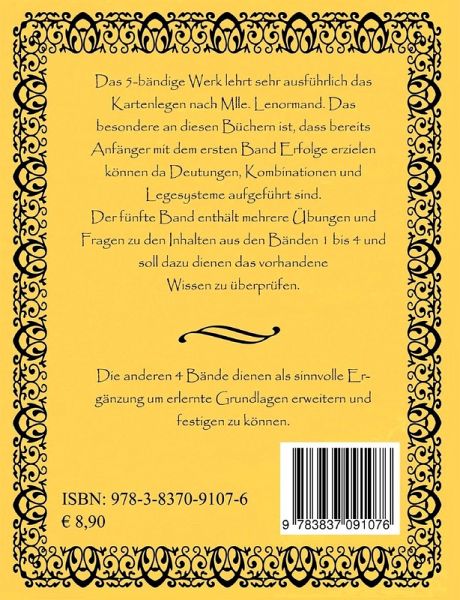 Das 5-bändige Werk lehrt sehr ausführlich das Kartenlegen nach Mlle. Lenormand. Das besondere an diesen Büchern ist, dass bereits Anfänger mit dem ersten Band Erfolge erzielen können, da Deutungen, Kombinationen und Legesysteme aufgeführt sind.Der fünfte Band enthält mehrere Übungen und Fragen zu den Inhalten aus den Bänden 1 bis 4 und soll dazu dienen das vorhandene Wissen zu überprüfen.
