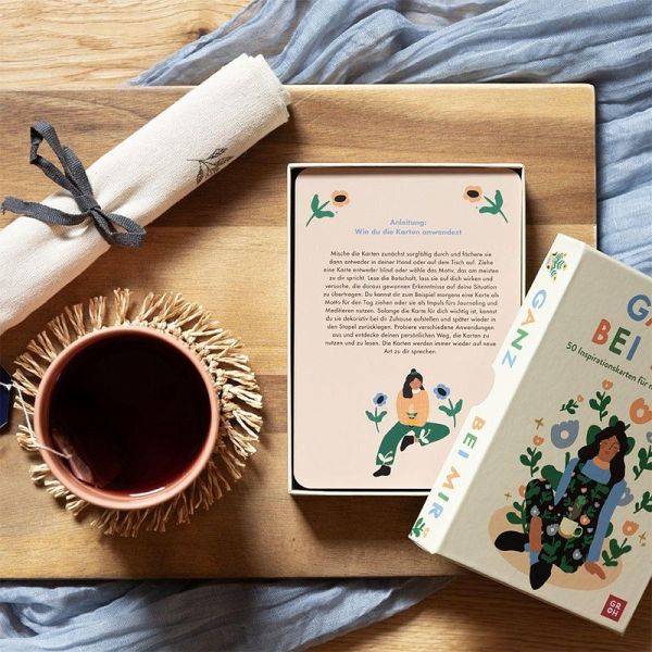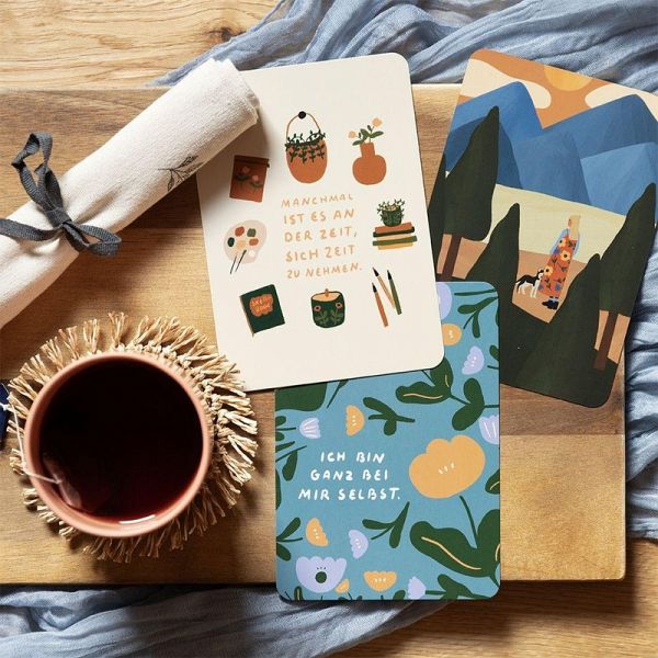 Mische die Karten zunächst sorgfältig durch und fächere sie dann entweder in deiner Hand oder auf dem Tisch auf. Ziehe eine Karte entweder blind oder wähle das Motiv, das am meisten zu dir spricht. Lese die Botschaft, lass sie auf dich wirken und versuche, die daraus gewonnen Erkenntnisse auf deine Situation zu übertragen. Du kannst dir zum Beispiel morgens eine Karte als Motto für den Tag ziehen oder sie als Impuls fürs Journaling und Meditieren nutzen. Solange die Karte für dich wichtig ist, kannst du sie dekorativ bei dir Zuhause aufstellen und später wieder in den Stapel zurücklegen. Probiere verschiedene Anwendungen aus und entdecke deinen persönlichen Weg, die Karten zu nutzen und zu lesen. Die Karten werden immer wieder auf neue Art zu dir sprechen.