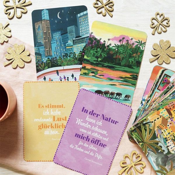 Mische die Karten zunächst sorgfältig durch und fächere sie dann entweder in deiner Hand oder auf dem Tisch auf. Ziehe eine Karte entweder blind oder wähle das Motiv, das am meisten zu dir spricht. Lese die Botschaft, lass sie auf dich wirken und versuche, die daraus gewonnen Erkenntnisse auf deine Situation zu übertragen. Du kannst dir zum Beispiel morgens eine Karte als Motto für den Tag ziehen oder sie als Impuls fürs Journaling und Meditieren nutzen. Solange die Karte für dich wichtig ist, kannst du sie dekorativ bei dir Zuhause aufstellen und später wieder in den Stapel zurücklegen. Probiere verschiedene Anwendungen aus und entdecke deinen persönlichen Weg, die Karten zu nutzen und zu lesen. Die Karten werden immer wieder auf neue Art zu dir sprechen.