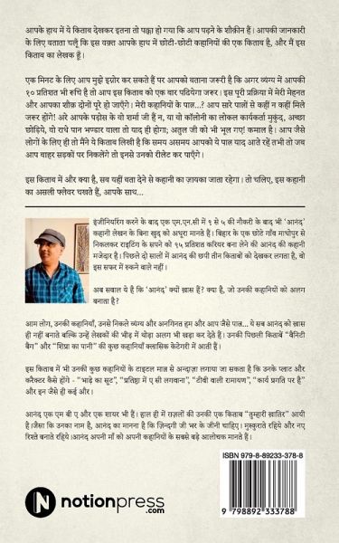 As I see this book in your hands, it is for sure, you love reading. To upgrade your information, let me tell you that this is a book of short stories (all satires) and by chance I am the writer of this book. You can ignore me for a while, but this becomes my duty to tell you that if you have even 10% interest in Satires, then you must read this book once. In this whole process, my efforts, and your interest, both will be met. You asked, who are the characters of my stories I am sure you must have met all of them somewhere, at least once. Ok, let me remind you - do you remember that 'Sharma' in your neighborhood, or that 'Mukund' who is a local popular boy in the street. Ok, you must remember that 'Raadhe Paan Waala'. So, you forget Atul ji also. That is surprising. You will not believe; you people are the reason for whom I have written this book. So that when you will find these characters in real, you will be able to relate them with those in the book. This will not be fair enough to share more about the book, right this time. Believe me, this will spoil the flavor of this book. So better come with me and taste the real flavor of this book, with me. - Anand