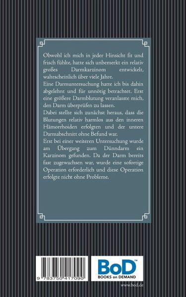 Obwohl ich mich in jeder Hinsicht fit und frisch fühlte, hatte sich unbemerkt ein relativ großes Darmkarzinom entwickelt, wahrscheinlich über viele Jahre.Eine Darmuntersuchung hatte ich bis dahin abgelehnt und für unnötig betrachtet. Erst eine größere Darmblutung veranlasste mich, den Darm überprüfen zu lassen.Dabei stellte sich zunächst heraus, dass die Blutungen relativ harmlos aus den inneren Hämorrhoiden erfolgten und der untere Darmabschnitt ohne Befund war.Erst bei einer weiteren Untersuchung wurde am Übergang zum Dünndarm ein Karzinom gefunden. Da der Darm bereits fast zugewachsen war, wurde eine sofortige Operation erforderlich und diese Operation erfolgte nicht ohne Probleme.