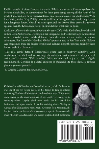 Phillip thought of himself only as a scientist. When he took on a Khutani symbiote he became a kashallan, to communicate for these great beings among all the races of the world Timorna. Now he's a respected leader on a mission to cross the Shallow Sea. With his young symbiote Yoey, Phillip must form alliances among warring clans in preparation for a dangerous future. Not all the clans agree, and the demon Tessa carries has its own agenda. Even the Khutani are not of one mind about what shall be done. Kashallan Alliance is the seventh book in the series Tales of the Kashallans, by celebrated author Celu Amberstone. Drawing on her Indigenous and Celtic heritage, Amberstone writes powerful fiction subtly different from the usual science fiction or fantasy adventures. For fans of the 'Hundred Worlds' approach used in Star Trek and in Golden Age magazines, there are diverse settings and cultures along the journey taken by these human and alien characters. "This is space opera writ large combined with both fantasy and hard SF... It's obvious the Tales of the Kashallans constitute a genuine epic written with such skill that you will be enthralled however long the series lasts. "This is a richly detailed fantasy/space opera that is positively addictive. Celu Amberstone has the knack of weaving elaboration and action into a vivid tapestry of action and character. Well rounded, deftly written, and a joy to read. Highly recommended. Consider it a useful antidote to mundane life these days... a genuine pleasure you owe yourself." -R. Graeme Cameron for Amazing Stories. "Amberstone's world-building puts together brave new peoples and gritty adventures, evoking strong responses in the reader." - author Paula Johanson