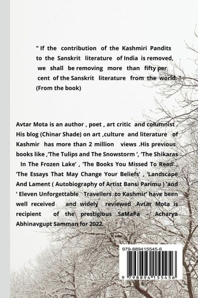 Kashmir has produced many poets, critics, historians, aestheticians, logicians, musicians, rhetoricians, philosophers, grammarians, translators and Shaiva Darshana scholars right up to the 16th -century. Some among them rose to eminence the world over for their original contribution. Poetical works covering a wide diversity of themes viz; historical, religious, devotional, didactic, romantic, satirical and even erotic as well as philosophical treatises, expounding the views of a distinct school of Śhaivism that developed in Kashmir, works dealing with poetics and music, anthologies and lexicons, the works of the prolific writer Kṣhemendra, especially the Bṛhatkathāmañjarī and Somadeva's Kathāsaritsāgara -all these and many other works on diverse topics, touching upon various aspects of human life constitute a rich legacy of which, any part of India may feel proud. The book informs about the contribution of Kashmiris to the Sanskrit literature of India, the ancient musical instruments of Kashmir, the sacred water bodies of Kashmir, the sacred trees of Kashmir, the journey of Kashmiri shawls to Europe and Russia, the contribution of Kashmiri artists for the development of Pahari Miniature Art in India, the contribution of Punjabi Khatris towards the development of trade and commerce in Kashmir, Vanvun singing of Kashmiris right from Vedic age and some more engrossing topics.