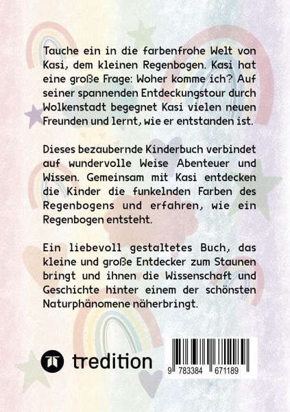 Tauche ein in die farbenfrohe Welt von Kasi, dem kleinen Regenbogen. Kasi hat eine große Frage: Woher komme ich? Auf seiner spannenden Entdeckungstour durch Wolkenstadt begegnet Kasi vielen neuen Freunden und lernt, wie er entstanden ist. Gemeinsam mit Kasi entdecken die Kinder die funkelnden Farben des Regenbogens und erfahren, wie ein Regenbogen entsteht. Ein liebevoll gestaltetes Buch, das kleine und große Entdecker zum Staunen bringt und ihnen die Wissenschaft und Geschichte hinter einem der schönsten Naturphänomene näherbringt.