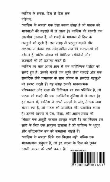 Kasim Ke Lafz "Kasim Ke Lafz" is a soulful collection of poems by Mohammad Kasim Darad (MK Darad), delving deeply into themes of love, longing, betrayal, and the journey of life. Each poem in this collection resonates with the profound emotions emanating from the heart, reaching out to touch the hearts of readers. Key Poems: Khamoshi Ki Zanjeer (Chains of Silence): The story of emotions shackled in silence. Bekarari Ki Raatein (Nights of Restlessness): A depiction of sleepless nights when the heart's restlessness is at its peak. Bewafai Ka Ilzam (Accusation of Betrayal): A portrayal of the pain and deceit in love. Ab Kya Fark Padta Hai (Now What Difference Does It Make): The courage to move forward, leaving the past behind. Azaad Kiya (Set Free): The sense of freedom and new beginnings for the soul. These poems connect readers with unforgettable moments in their lives. Mohammad Kasim Darad's writing breathes new life into each poem, leaving a lasting echo in the hearts of readers. "Kasim Ke Lafz" is not just a collection of poems but a unique journey of emotions that will touch every reader's heart. Through this book, you will encounter those unspoken feelings in your life that you might have never expressed before.