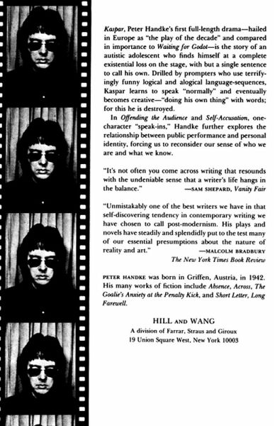 Nobel Prize winner Peter Handke's first full-length drama, hailed in Europe as "the play of the decade" and compared in importance to Waiting for Godot Kaspar is the story of an autistic adolescent who finds himself at a complete existential loss on the stage, with but a single sentence to call his own. Drilled by prompters who use terrifyingly funny logical and alogical language-sequences, Kaspar learns to speak "normally" and eventually becomes creative--"doing his own thing" with words; for this he is destroyed. In Offending the Audience and Self-Accusation, one-character "speak-ins," Handke further explores the relationship between public performance and personal identity, forcing us to reconsider our sense of who we are and what we know.