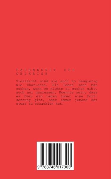 F A D E N K U N S T D E R O E L K R I S EVielleicht sind sie auch so neugierig wie Charlotte. Ein Leben kann man suchen, wenn es nichts zu suchen gibt, auch nur genießen. Könnte sein, dass es für ein Leben immer eine Fortsetzung gibt, oder immer jemand der etwas zu erzählen hat.