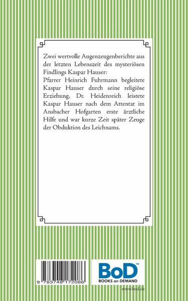 Zwei wertvolle Augenzeugenberichte aus der letzten Lebenszeit des mysteriösen Findlings Kaspar Hauser: Pfarrer Heinrich Fuhrmann begleitete Kaspar Hauser durch seine religiöse Erziehung; Dr. Heidenreich leistete Kaspar Hauser nach dem Attentat im Ansbacher Hofgarten erste ärztliche Hilfe und war kurze Zeit später Zeuge der Obduktion des Leichnams.