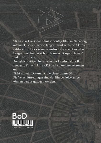 Als Kaspar Hauser am Pfingstmontag 1828 in Nürnberg auftaucht, ist es eine von langer Hand geplante Aktion.Zahlreiche Codes können ausfindig gemacht werden.Anagramme finden sich im Namen "Kaspar Hauser" und in Nürnberg.Drei gleichseitige Dreiecke in der Landschaft (z.B. Beuggen, Pilsach, Linz a.R.) decken weitere Personen auf.Nicht nur ein Datum hat die Quersumme 32.Die Verschlüsselungen sind da. Einige Folgerungen können daraus gezogen werden.